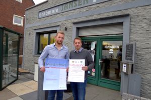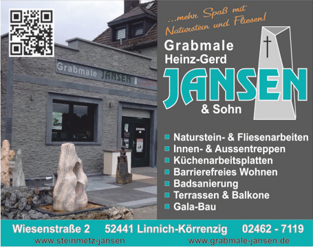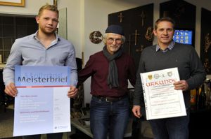 Dass in einem Handwerksbetrieb gleichzeitig ein silberner- und ein Meisterbrief verliehen wird, ist eher eine Seltenheit. Beim Körrenziger Steinmetzbetrieb Jansen war dies jüngst der Fall. Firmengründer Heinz Gerd Jansen legte im Jahre 1992 seine Meisterprüfung ab und sein Sohn Marc in diesem Jahr. Seit nunmehr 26 Jahren ist das Unternehmen in Körrenzig ansässig. Karl Goffart, Obermeister der Steinmetz- und Steinbildhauer-Innung Aachen, war eigens aus diesem Anlass gekommen, um die beiden Meisterbriefe zu überreichen. „Ich kenne Heinz-Gerd Jansen schon seit 26 Jahren. Er hat als junge Mann mit viel Engagement etwas auf die Beine gestellt und sich mit viel Herzblut behauptet“, rückte er die Leistung des Firmeninhabers ins rechte Licht. Goffart weiß selbst, wie schwer es ist, sich als kleiner Betrieb auf den ständigen Strukturwandel in einer dynamischen Marktwirtschaft einzustellen. „Nur dann, wenn wir uns ständig weiterbilden und auf etwas Neues einstellen, können wir bestehen, sonst schwemmt die Industrie uns weg“, so Goffart. Es freute ihn ganz besonders, dass mit Marc Jansen ein so junger Mann die Mühen der Meisterprüfung auf sich genommen hat. Er hat sich jetzt schon im Betrieb auf den Baubereich und Fliesenarbeiten spezialisiert.