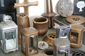 Zubehör: In unserer Ausstellung haben wir einen Querschnitt an stilvollem Grabzubehör zusammengestellt. Grableuchten mit passenden Vasen runden das Gesamtbild ab, und dokumentieren das Gedenken an den Verstorbenen.